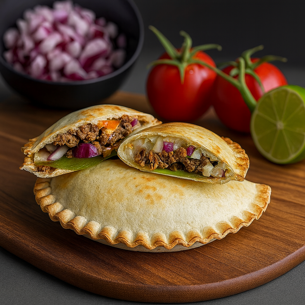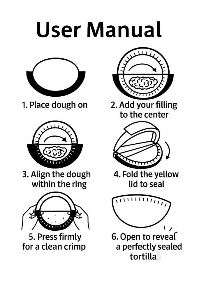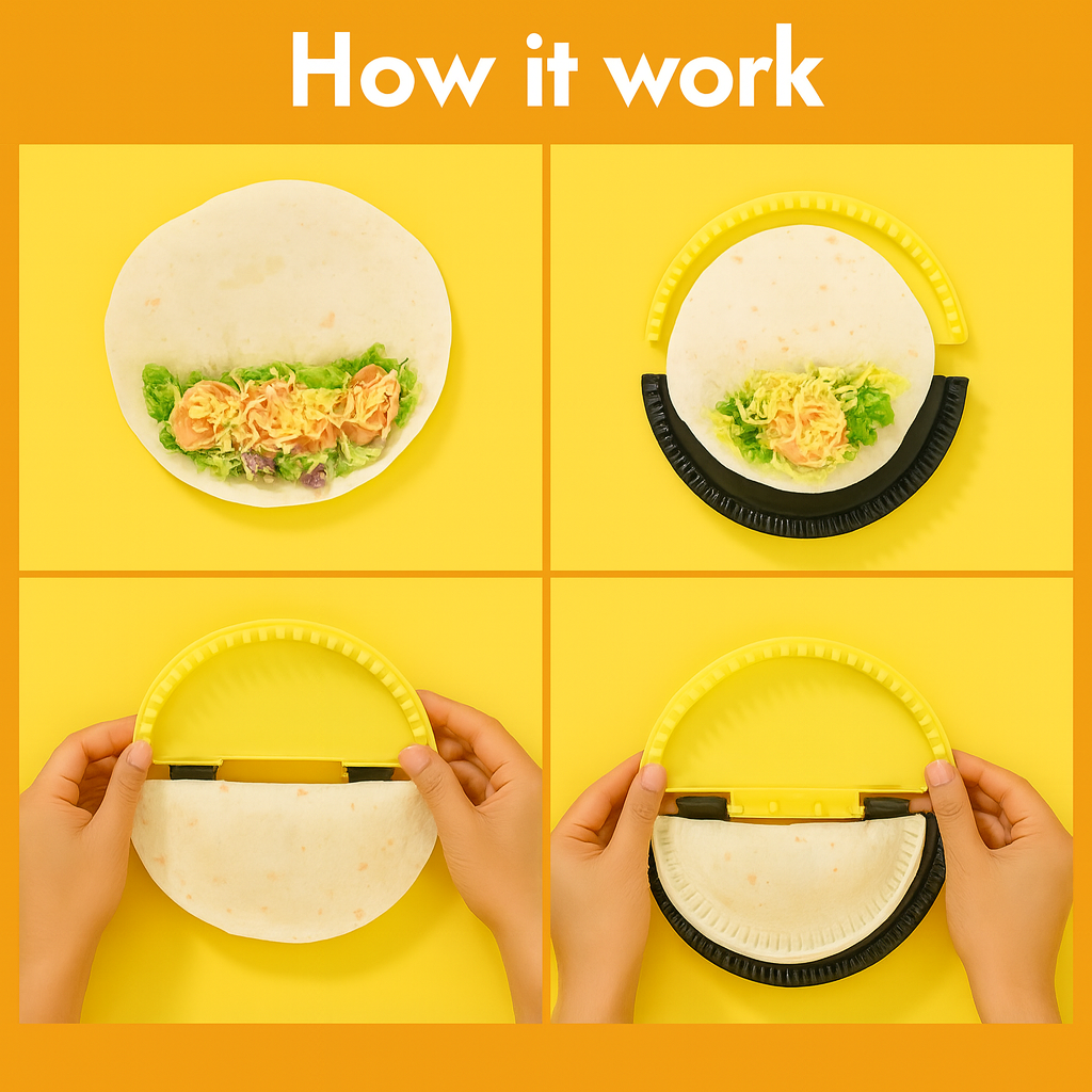 Add beef, onion, cilantro, squeeze lime, spoon sals Fold & crimp with Tortilla Sealer. Set tortilla on sealer, take on tortilla fillings and crimp it together with sealer.