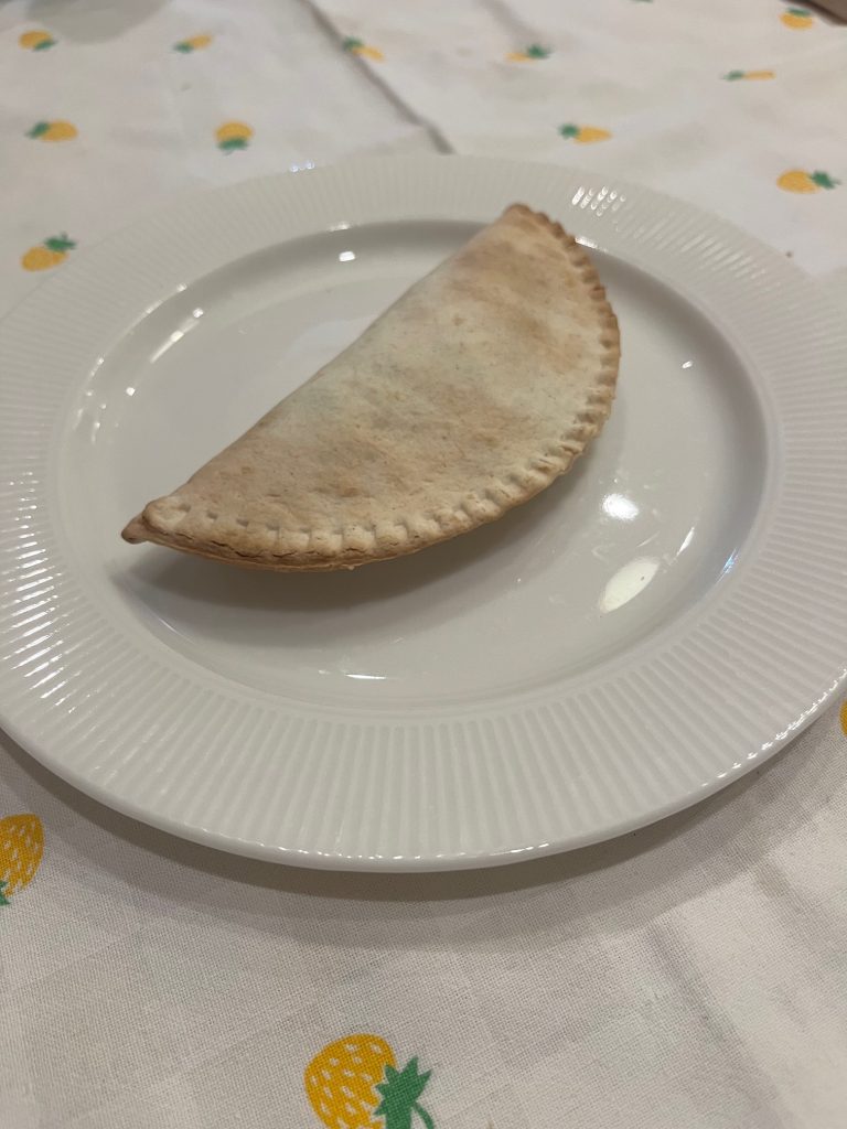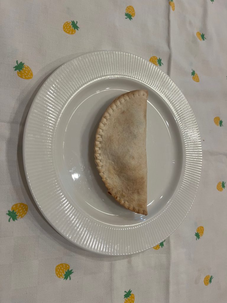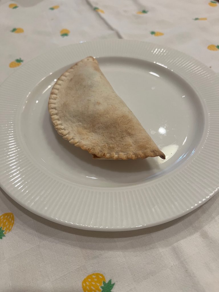 Carefully lift the sealed tortilla pocket (now a sealed empanada or pie).